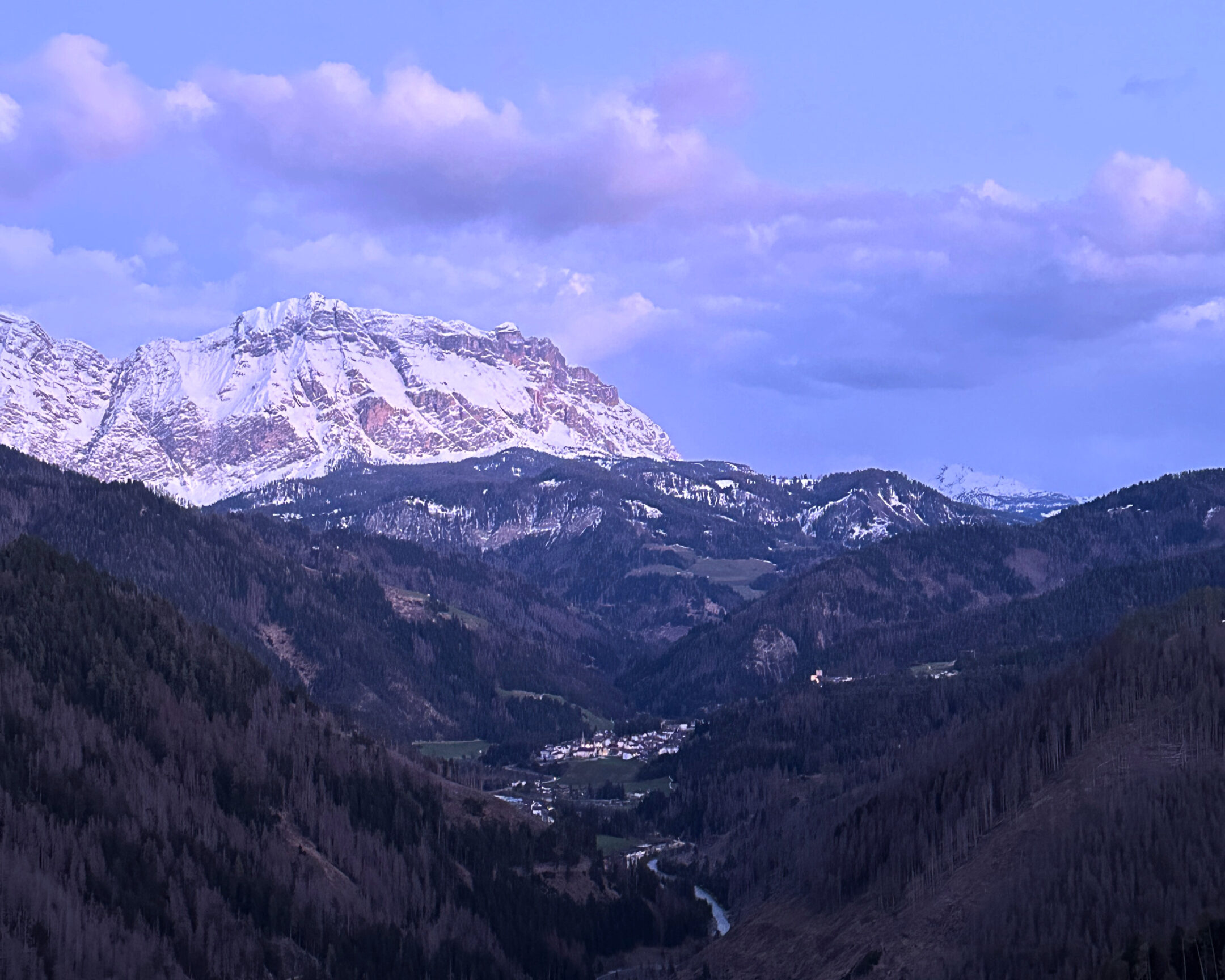Snötäckta bergstoppar i bakgrunden, i förgrunden en dal med ett litet vattendrag. Molnen är vagt rosa, och hela bilden har ett ljuslila sken.
